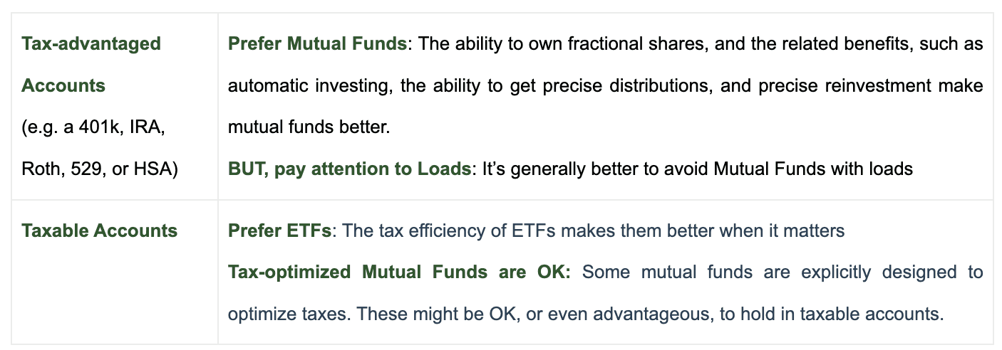 As a result of this, ETFs are much more efficient than Mutual Funds. Investors should avoid holding Mutual Funds in taxable accounts for this reason.